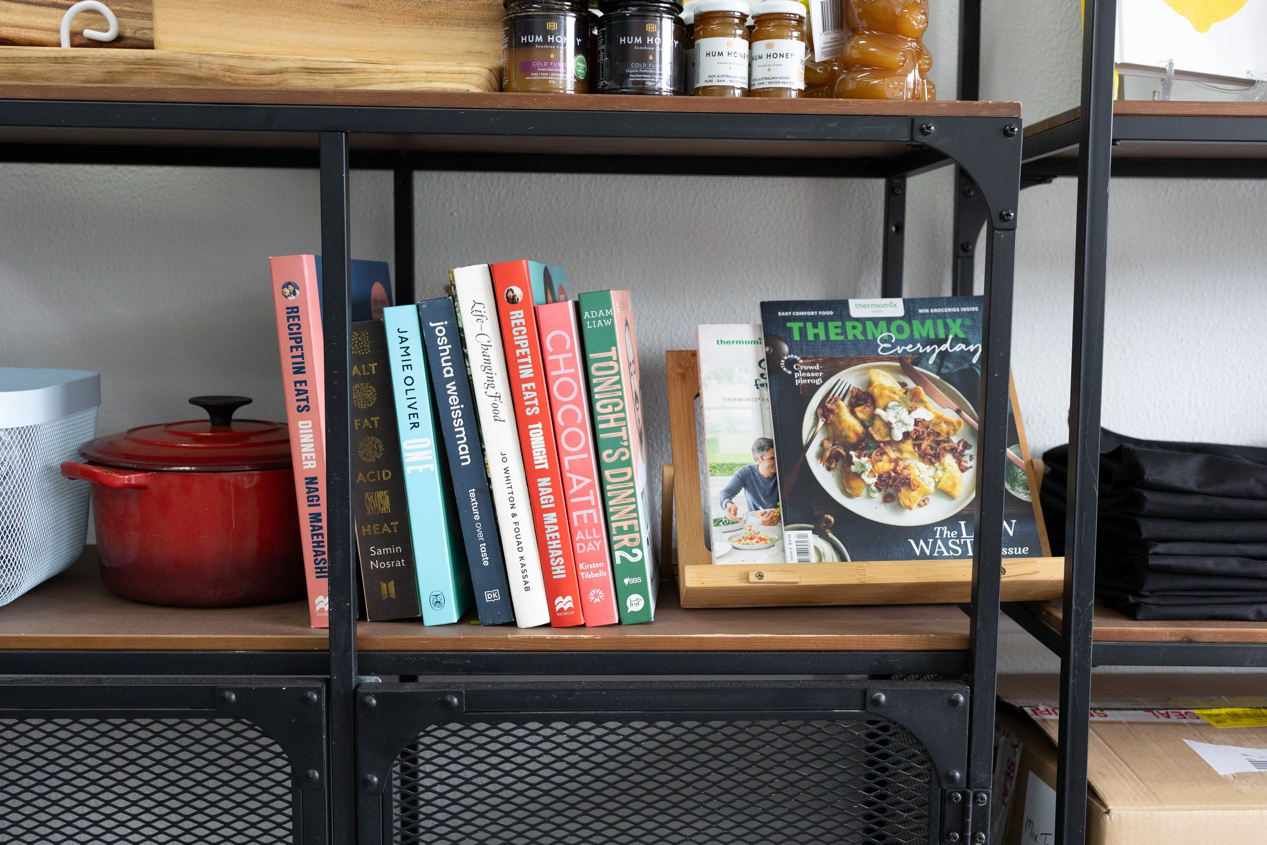 The Mix Taste Eat studio kitchen includes cooking stations, an oven, stovetops, air fryers, a TM6 Thermomix, preparation areas and standard cookware to help you cook comfortably.